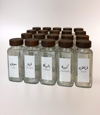 مجموعة علب بهارات زجاجية بستكرات مقاومة للماء والرطوبة الحجم: 250 ml العدد :20 علبة الغطاء : بخشب البامبو | فتحتين مختلفات أسماء البهارات في المجموعة: بهارات الدجاج-بهارات اللحم-بهارات السمك- بهارات مخلوطة-كركم-ملح-كاري-سماق-اوريغانو-اكليل الجبل-هيل-قرفة-قرنفل-فلفل احمر-فلفل اسود-فلفل مجروش-بابريكا-كزبرة-زعتر-كمون